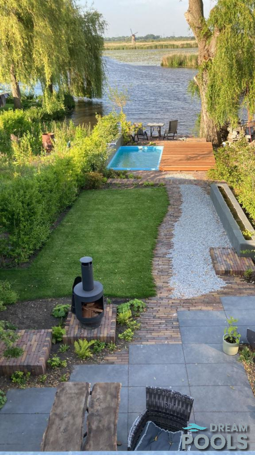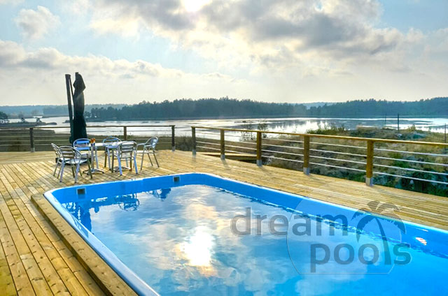 Fiberglass dream pool by the lake. Imagine waking up to a stunning view of a lake, stepping outside, and diving into your very own pool. This dream can become a reality with a Dreampools polyester pool, the ideal choice for those looking to combine luxury, comfort, and practicality. Whether you’re relaxing with a book, cooling off on hot summer days, or hosting friends, a Dreampools pool is the perfect addition to your lakeside property.
